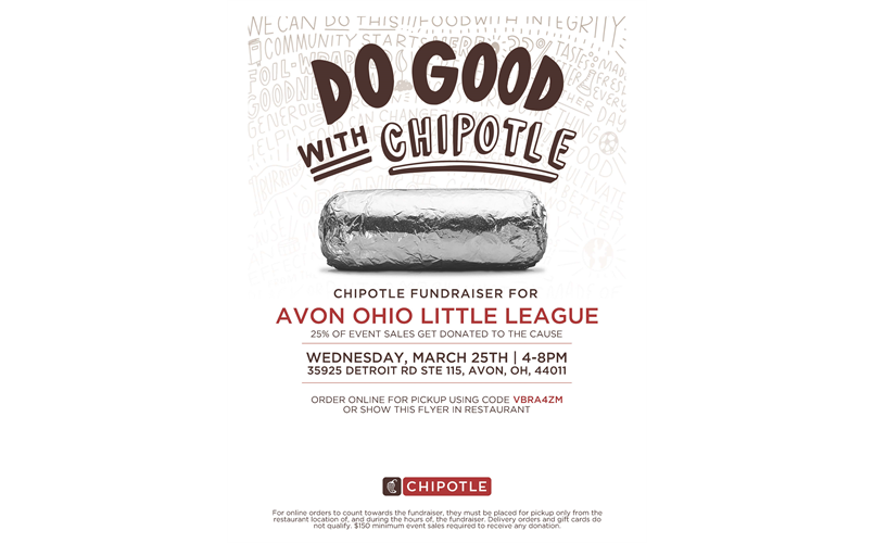 Come down to Chipotle (35925 Detroit Rd) Wednesday March 25th, 2026 (4pm-8pm) to help support Avon Little League- 25% of event sales will go to support our Avon Softball and Baseball programs.