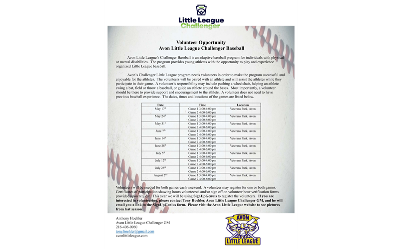 If you are interested in volunteering, please contactTony Hoehler, Avon Little League Challenger GM, for more information.