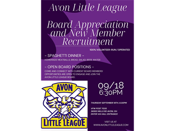 Join us at the VFW on September 18th at 6:30pm for an evening of appreciation and opportunity with the Avon Little League Board! We're celebrating our dedicated board members and welcoming new faces to help keep the tradition of Avon softball and baseball alive for generations.